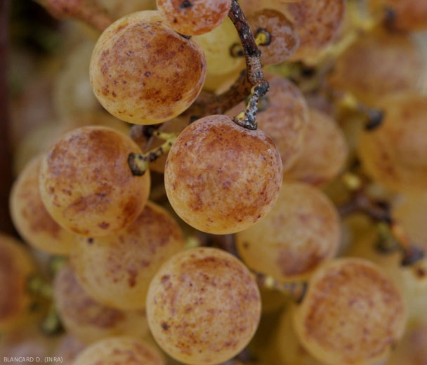 Before this botrytization process , the grape berries are golden, with thick skin, slightly pigmented with brown. Under the action of Botrytis , they then take a chocolate brown hue, then turn purple or even midnight blue before wilting. We then say that the grape is "roasted". These transformations are due to a significant loss of water, but also to an intense enzymatic maceration of their skin. By way of example, remember that the pectinase activity observed in a rotten berry is about a hundred times greater than that measured in a healthy berry.