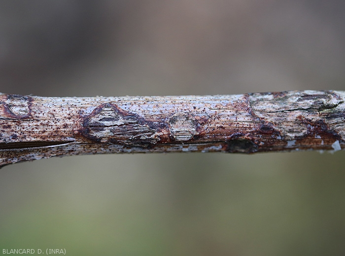 Localized and elongated lesions form on young herbaceous twigs which are particularly sensitive; moist, elliptical in shape and varying in color between brown, black and purple, they can modify the development of young shoots (Figure 8). They extend and progress in depth, reaching the marrow. At the end of the development, these lesions spread and become clearer in their center (figure 9); they can give rise to more or less marked and severe hollow cankers, making the twigs more brittle or causing them to dry out and die (Figures 10 and 11). Lesions on petioles and tendrils are identical (Figure 12). Such lesions can be observed on woods in winter (figure 13).