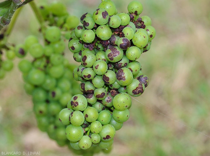 Circular and slightly concave brown spots appear on the young berries disrupting their growth (Figure 14). They have the shape of a bird's eye (the Anglo-Saxons speak of bird's eye rot); sometimes lighter in their center, they have a rather purplish black color on the periphery. When attacked early, young clusters can turn black and dry out (Figures 15-17).