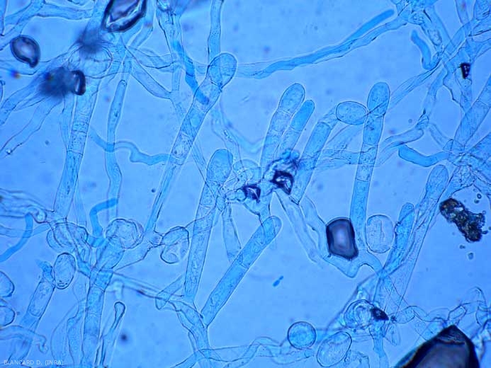 Within 4-7 days of infection with these fungi, short conidiophores develop on secondary hyphae on the leaf surface and produce chain conidia. The sporulation can be more or less abundant depending on the host and the climatic conditions.