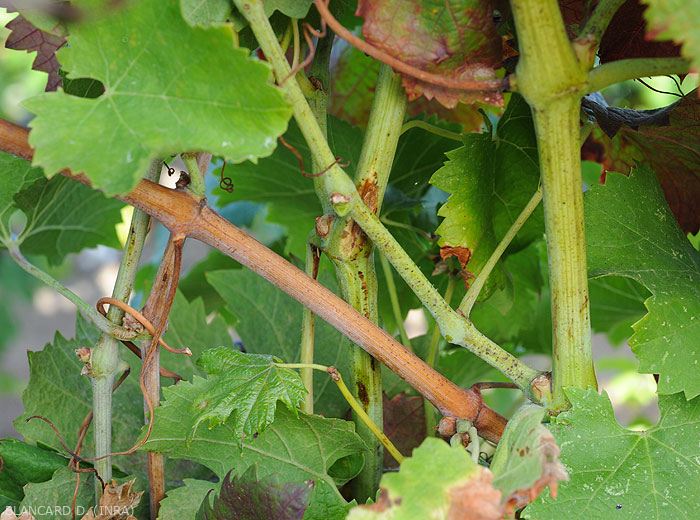 On this red grape vine we can see vine twigs with or without August.  (<b> flavescence dorée </b>)