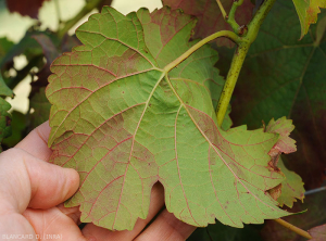 Appearance of sectorial reddening under the blade of a red grape leaf.  (<b> flavescence dorée </b>)