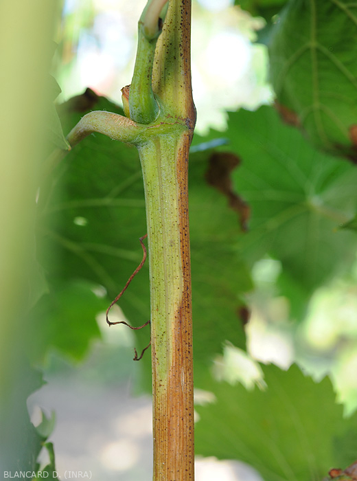 Absence of ripening of a vine branch which keeps its green color.  (<b> flavescence dorée </b>)