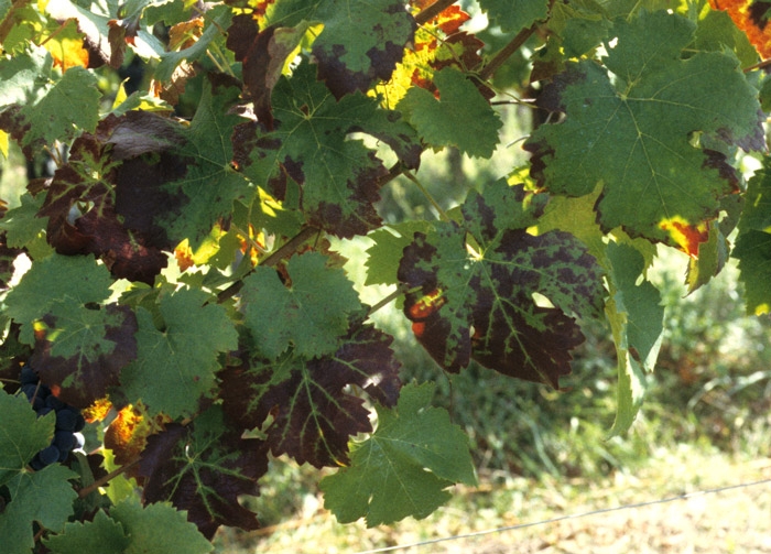 On these two black grape vines on the left and white on the right, only part of the foliage shows symptoms of <b> flavescence dorée </b>