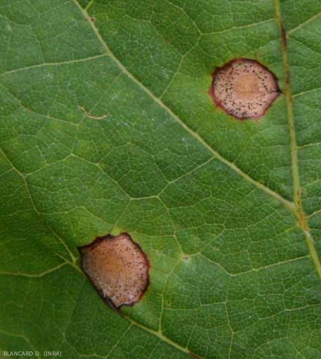 Pycnidia are clearly visible on these two spots.  <i> <b> Guignardia bidwellii </b> </i> (Black rot)