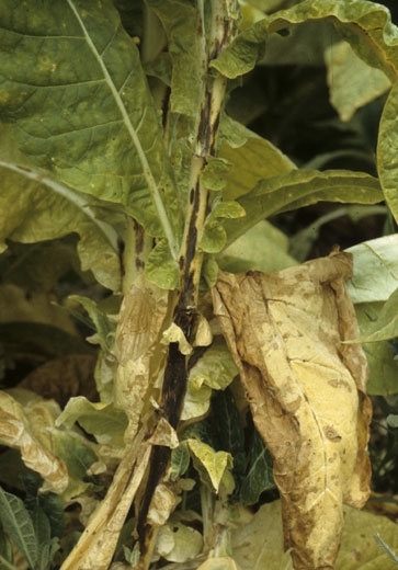 A wet, brown rot is decaying the cortex at the stem basis of this tobacco plant.  <i><b>Pectobacterium</i> sp.</b> (<i>Erwinia</i> sp., hollow stalk)
