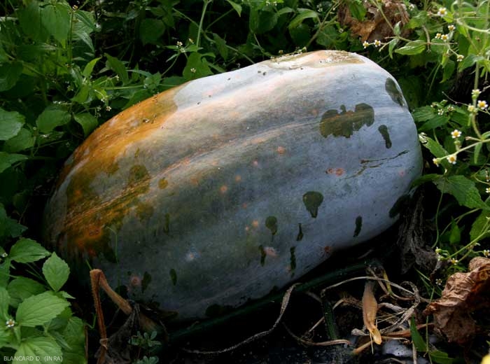 Butternut squash from Provence partially covered with small gummy beige spots with more or less a brown border.  <i> <b> Xanthomonas cucurbitae </b> </i> (<i> Xanthomonas campestris </i> pv. <i> cucurbitae </i>, bacterial gall, bacterial spot)