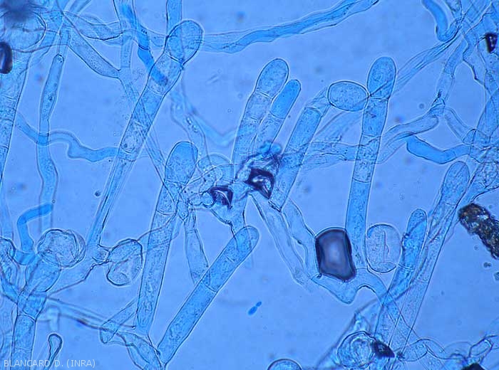 Detail of a cleistothecium of <i> Podosphaera xanthii </i> </b> observed under a light microscope.  We can clearly see the brown wall of the latter.  (powdery mildew)