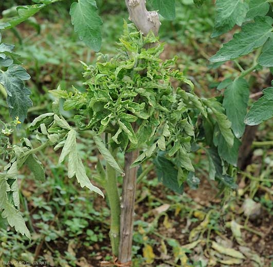 This plant, with a rather bushy port, has many axillary branches with very short internodes, and much smaller leaves.  <b> Yellow leaf curl virus </b> (<i> Tomato yellow leaf curl virus </i>, TYLCV)