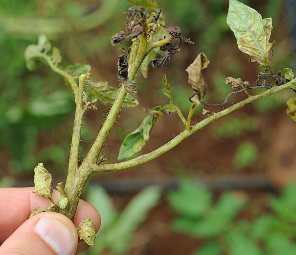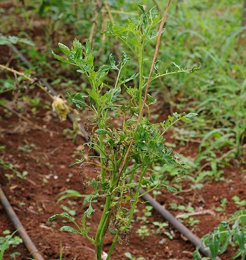 - intentar erradicar los primeros brotes eliminando las primeras plantas afectadas y / o tratando localmente las últimas y las plantas circundantes. Para ser eficaz contra los ácaros, las aplicaciones deben involucrar un gran volumen de mezcla y esto con suficiente presión para acceder al “corazón” de la vegetación. La eficacia de los tratamientos debe controlarse a lo largo del tiempo (tenga en cuenta que no se autoriza el uso de plaguicidas en tomate en e-phy y que P. latus ha desarrollado resistencia a varios plaguicidas en todo el mundo);