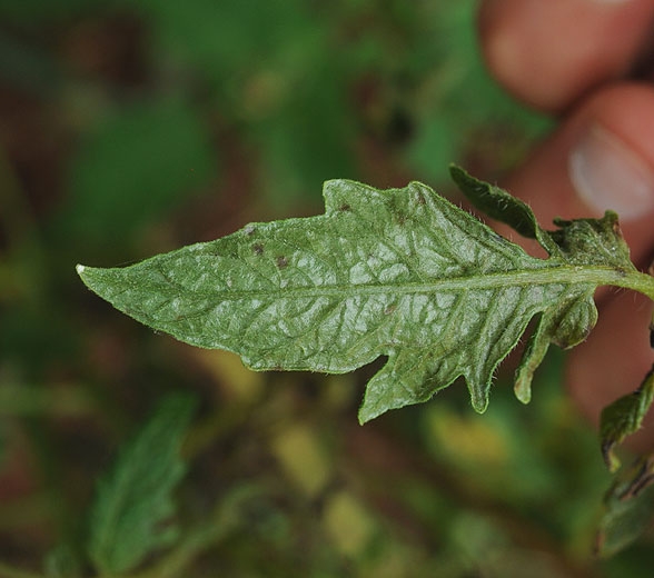 Las hojas se rizan fuertemente, también están arrugadas, más gruesas y rígidas. A veces tienen un tinte de bronce a marrón y su parte inferior tiene reflejos metálicos. Aparecen áreas de tejido pardusco y suberizado debajo de las hojas, en los pecíolos ...