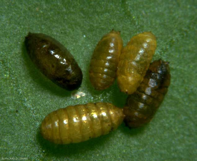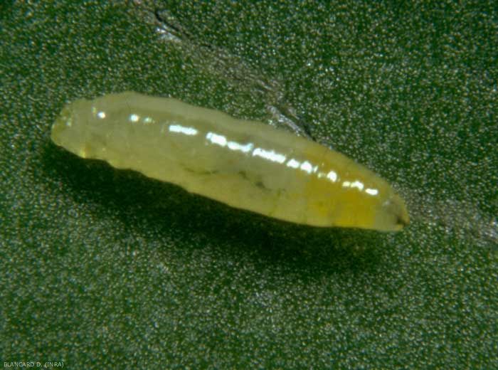 - Etapas de desarrollo : los huevos (figura 4-1), de color crema y forma ovalada (los de Liriomyza bryoniae miden 0,12 x 0,27 mm), se depositan en los tejidos durante las picaduras de puesta con el uso de la hembra. oviscapto. Una hembra puede producir varios cientos de huevos que posteriormente eclosionan y dan a luz larvas transparentes de 0,5 mm de largo (Figura 4-2) (Figura 5). Estos cavan galerías en los folletos que la presencia de excrementos negros hace claramente visibles. Las larvas blancas del tercer estadio de 2,5 mm de largo perforan la hoja, dejan los folíolos, caen en pliegues de plástico o en el suelo y se entierran poco a poco. Posteriormente, se transforman en pupas (Figura 4-3) con forma de barril y cuyo color varía a medida que envejecen desde el amarillo al marrón oscuro (Figura 6), siendo las pupas negruzcas las que suelen ser parasitadas. La pupación de Chromatomyia horticola tiene lugar en la hoja: el pupario, cubierto por la epidermis de la hoja, es entonces visible en forma de una pequeña protuberancia al final de la galería larvaria. Los adultos (Figura 4-4) son pequeñas moscas de 2 a 3 mm de largo, amarillas y negras ( Liriomyza spp., 7) o gris oscuro (C hromatomyia horticola ). Las hembras adultas, presentes en la superficie superior del limbo, perforan la epidermis gracias a la verdadera barrena que es su ovipositor, chupan el jugo de la verdura (bocado nutritivo) y depositan sus huevos (bocados de puesta de huevos). Tenga en cuenta que los machos, desprovistos de barrenas, también aprovechan las picaduras para alimentarse.