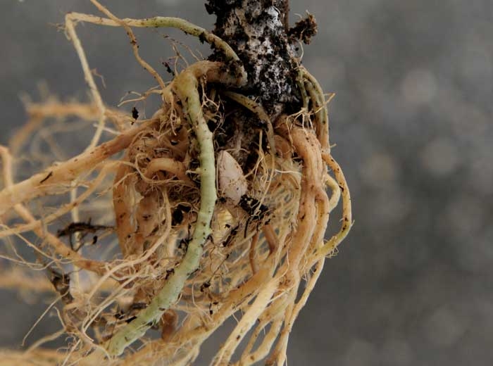La causa de este marchitamiento se encuentra en el cuello de los tallos del melón. Aquí se ha desarrollado una lesión húmeda, una pudrición que ha ido ganando progresivamente la parte inferior del tallo y la raíz principal, pero también la parte superior del sistema radicular (figura 1). En el cuello , los tejidos alterados están húmedos y muestran un tinte de oscuro a parduzco. Esta lesión acaba rodeando la varilla durante varios centímetros (figura 2). Las raíces situados en el mismo estrato del suelo también se ven afectados (Figura 3). Su corteza se vuelve amarilla, marrón y se descompone.