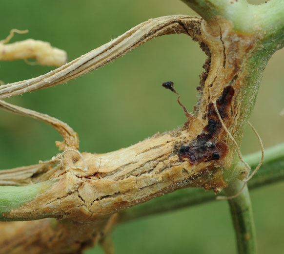 - Cambios de cancillería en el cuello y el tallo (figuras 1 a 5). Estos suelen ser de color verde oscuro y húmedos al inicio del ataque y pueden medir entre 5 y 15 centímetros. Pueden aparecer gotitas gomosas de color ámbar en la superficie, oscureciéndose a medida que se oxidan (Figuras 6 y 7). Posteriormente, estas lesiones se secan, se curan, adquieren un tinte pardusco y, en ocasiones, están sembradas de multitud de microesclerocios negros (50 a 200 µm) (figuras 8 y 9) y picnidios. Tenga en cuenta que las lesiones en el tallo recuerdan a las causadas por Didymella bryoniae ;