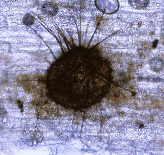 El hongo produce pequeñas estructuras globulares negras (picnidios) (Figura 1) en las células epidérmicas y corticales de las raíces infectadas. Los conidios unicelulares e hialinos (figura 2) se liberan de ellos, incluidos; no se ha estudiado su papel en el ciclo epidémico de la enfermedad. Tenga en cuenta que las plantas contaminadas (especialmente la cebolla) pueden asegurar la propagación de la enfermedad y la infestación de nuevas parcelas. Lo mismo ocurre con los aperos de labranza que se trasladan de una parcela infestada a otra sana. También contribuyen las escorrentías de agua y partículas del suelo.