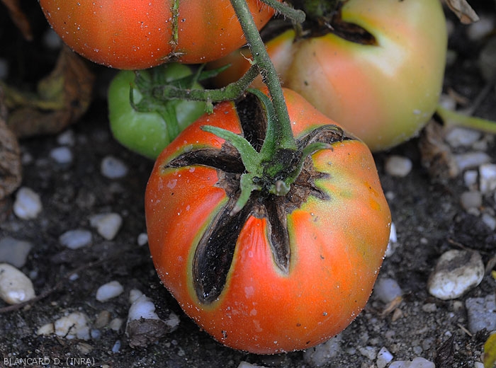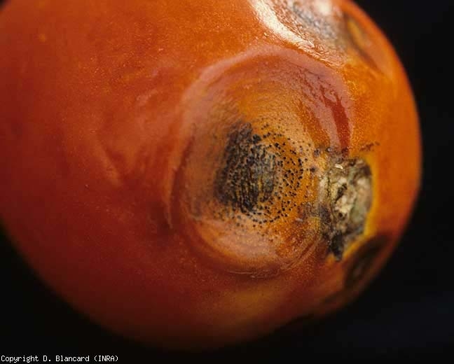 Inicialmente aparecen en los frutos lesiones de tamaño limitado y contorno mal definido, cóncavo y húmedo. A menudo se encuentran cerca del tallo o en el área del tallo de la fruta llamada "hombro" ( hombro ) por los anglosajones (Figuras 1 a 3). Posteriormente, se diseminan gradualmente y los tejidos subcuticulares ubicados en su centro pronto se vuelven marrones y luego ennegrecidos. Nótese que Alternaria alternata puede colonizar secundariamente el extremo del fruto (figura 4), como otras especies de Alternaria , y en particular las lesiones provocadas por la enfermedad fisiológica denominada necrosis apical del tomate.
