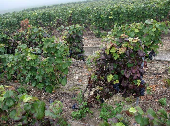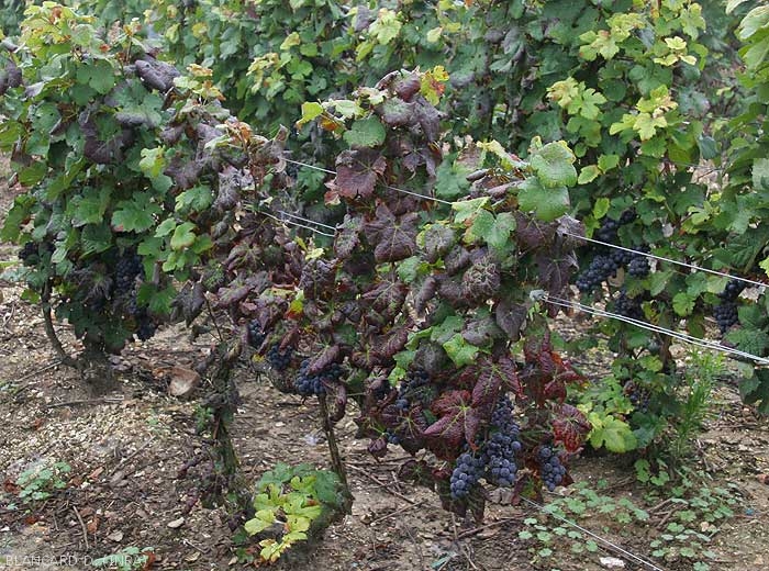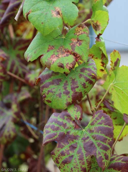 - En las variedades de uva tinta, las hojas situadas en la parte inferior de las ramitas se vuelven rojas en manchas más o menos grandes debido a la acumulación de antocianinas, mientras que las nervaduras principales permanecen verdes (figuras 1 a 4) y la hoja se engrosa. El enrojecimiento se vuelve progresivamente general en el limbo (Figuras 7 a 14). Tenga en cuenta que al final de la temporada las hojas afectadas se vuelven marrones y mueren.
