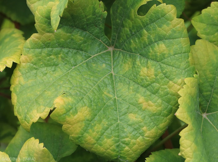 - En las variedades de uva blanca, aparece gradualmente un amarilleo difuso en las hojas de la misma forma. Es bastante difícil diferenciar estas decoloraciones de otros síntomas, como los de la deficiencia o la fitoplasmosis (Figuras 15 a 17). En estas variedades de uva, la enfermedad es, por tanto, más insidiosa y puede pasar desapercibida.
