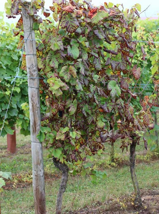 Sin ser fatal, este virus reduce la fertilidad y el vigor de la vid y, por tanto, el rendimiento de la uva. Provoca un retraso en la madurez de las bayas que puede tardar varias semanas, lo que perjudica el desarrollo de polifenoles. La intensidad de los síntomas varía según las variedades de uva, las especies virales predominantes y las condiciones climáticas del año en particular. GLRaV-2 (género Closterovirus ) también puede ser responsable de problemas de incompatibilidad del injerto, con degeneración de los vástagos.