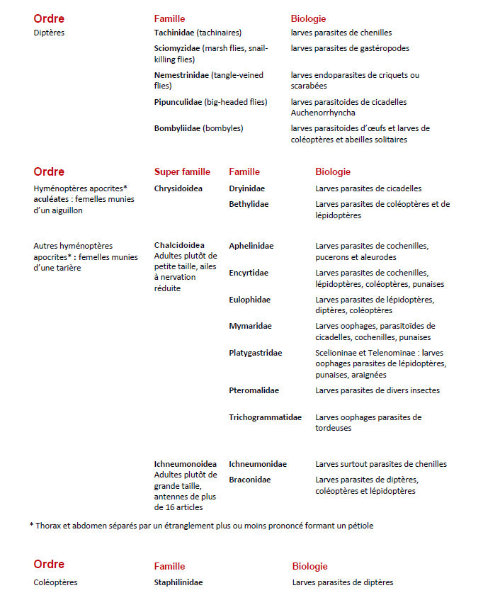 Un parásito es un organismo que vive a expensas de otro, llamado huésped. La mayoría de los parásitos entomófagos son insectos pertenecientes a los himenópteros, dípteros y coleópteros (ver tabla resumen, figura 1). Las larvas se desarrollan a expensas del organismo huésped. Cuando éste muere después de que se completa el desarrollo del parásito, estos parásitos en particular se denominan parasitoides. En los artrópodos parasitoides , siempre son los estadios larvales los que viven a expensas de un huésped cuya muerte provocan, y así es como se utilizan algunas especies en el control biológico. artrópodos Los parásitos generalmente no matan a su huésped, pero lo mantienen vivo el mayor tiempo posible; más bien, hay un equilibrio entre las dos partes.