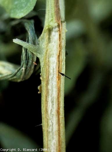 - des portions de vaisseaux altérées, observables après avoir réalisé une coupe longitudinale ou transversale de la tige. Ainsi, des lignes crémeuses, blanchâtres à jaunes, brunissant progressivement, sont visibles le long des vaisseaux et sur les tissus corticaux et la moelle proches (figures 4 et 5). En fonction des situations, les symptômes internes à la tige peuvent être très difficiles à détecter et nécessiter des coupes sur toute la longueur de la tige ou, au contraire, être particulièrement marqués avec des stries brunes vasculaires bien visibles. Une observation au microscope photonique de coupes histologique réalisées dans la zone vasculaire de la tige permet de constater la présence d'un mucus bactérien (figure 6) ;