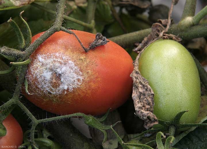 La misma pelusa blanquecina que se ve en los folíolos es ocasionalmente visible en la la superficie de fruta (Figura 14). Estos últimos se mantienen relativamente firmes independientemente de la precocidad del ataque. En algunos casos, los microorganismos secundarios pueden invadir los tejidos dañados y provocar varias pudriciones bastante suaves. Tenga en cuenta que algunas semillas de frutas enfermas serían la fuente de contaminación de futuras plántulas.