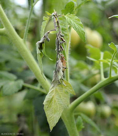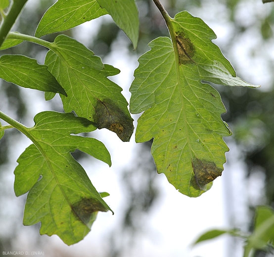 El mildiú velloso puede atacar todos los órganos aéreos del tomate . Se caracteriza por el desarrollo de manchas parches inicialmente húmedas , o incluso , en los folíolos (Figuras 1 y 2). Estos ataques localmente dan a los tejidos afectados un tinte de verde pálido a marrón verdoso . Con el tiempo, grandes porciones de la lámina de la hoja se ven afectadas y pronto se vuelven marrones y necrosa (Figuras 3 y 4). Estas manchas suelen estar rodeadas por un margen de tejido lívido y mal definido en el que a veces se forma, en la parte inferior de la hoja, un , discreto y fugaz plumón blanco , formado por los esporocistóforos y esporoquistes de P. infestans (Figuras 5 y 6). Cuando las condiciones son particularmente favorables, la progresión de los síntomas en los folletos es rápida. Las hojas, las ramitas e incluso las plantas eventualmente mueren y se secan por completo (Figura 7).