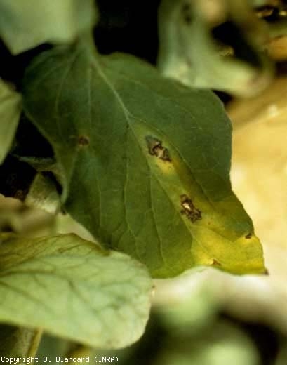 En pequeñas manchas parduscas todos los folíolos del tomate se pueden observar , ligeramente angulares, a veces discretamente halos por un borde clorótico (Figuras 1 y 4). Su tamaño suele limitarse a unos pocos milímetros, excepto en condiciones particularmente húmedas que favorecen su extensión y su confluencia. En este caso, pueden ocupar grandes porciones del limbo. Por lo general, las manchas se aclaran gradualmente y eventualmente adquieren un tinte grisáceo a medida que se necrotizan y se secan . Los fructíferos de cuerpos Stemphylium spp. (masas marrones correspondientes a conidios maduros) son visibles con una lupa binocular en ambos lados de la hoja. El tejido dañado tiene un aspecto opaco y, a veces, se divide (Figuras 3 y 4). Durante ataques particularmente severos, la alta densidad de manchas, su mayor extensión y su confluencia inducen una mortalidad foliar significativa, precedida por un amarillamiento (figura 5) y una caída más o menos sustancial de las hojas.