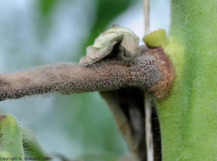Una vez que se forma el tubo germinativo, penetra en los tejidos y da lugar al micelio que destruye las paredes de las células y su contenido. La penetración se lleva a cabo directamente a través de la cutícula o de varias heridas , en particular en el tallo, a través de heridas de desprendimiento y desgarro de hojas. Las infecciones se producen aproximadamente después de unas quince horas . B. cinerea también se posa sobre el tomate a través de los tallos de los racimos y las heridas resultantes de su desarraigo. También puede invadir todos los tejidos senescentes, necróticos y / o muertos como pétalos, sépalos necróticos, foliolos viejos. A veces coloniza tejidos ya dañados por otros patógenos o plagas. Se propaga rápidamente a los tejidos, que se pudre en pocos días gracias a la hidrólisis de sustancias pépticas.