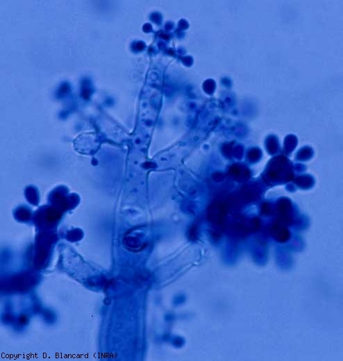 Botrytis cinerea se encuentra a veces en semillas . Es capaz de mantenerse en el suelo sobre los restos vegetales más diversos y en varias formas: conidios (figura 3), micelios o esclerocios (figura 4). Estos últimos persisten en el suelo durante varios años. Los potenciales saprofitos de B. cinerea permiten que se conserve fácilmente sobre materia orgánica. Es polífago y capaz de atacar y colonizar varios cientos de plantas cultivadas o malas hierbas que contribuyen a su conservación y constituyen posibles fuentes de inóculo, este es el caso de la mayoría de las plantas de huerta. Tanto en estas plantas como en sus esclerocios, esporula abundantemente. Por lo tanto, las contaminaciones primarias son a menudo aéreas y en este caso se trata de conidios que son muy fácilmente transportados por el viento. Estas esporas germinan en unas pocas horas (5 horas a 20 ° C) sobre hojas húmedas y / o en presencia de una humedad ambiental de al menos el 95%. La germinación de los conidios se ve fuertemente afectada a temperaturas superiores a 30 ° C.