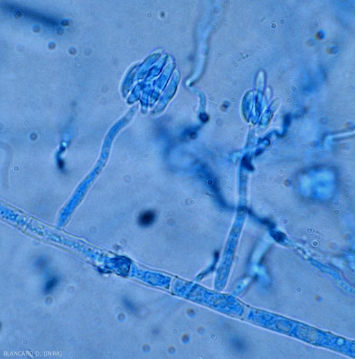 Este hongo produce clamidosporas , microconidios (figura 2) e incluso macroconidios (figura 3), en vasos y en tejidos colonizados y alterados. Puede diseminarse a mayores distancias a través de semillas y plantas contaminadas, por sustratos, agua, por maquinaria de labranza que se mueve de una parcela a otra y cuyos neumáticos están cargados con partículas de tierra y restos vegetales. El polvo del suelo que contiene clamidosporas se disemina fácilmente tanto por las corrientes de aire como por las salpicaduras de agua.