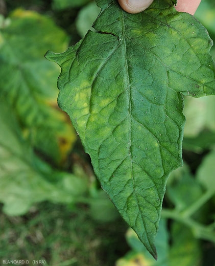 Las plantas afectadas por Verticillium dahliae muestran frecuentemente un discreto marchitamiento de los folíolos inferiores en los momentos más calurosos del día. Al principio, este marchitamiento es reversible de la noche a la mañana. Posteriormente, a medida que se desarrolla la enfermedad, se puede observar que ciertos sectores del limbo, a menudo interveinales y en forma de “V”, se ablandan gradualmente y se vuelven amarillos (figuras 1 a 3). Grandes porciones de los folíolos eventualmente se vuelven de color beige a marrón y luego se necrosa (Figuras 3 a 8). Los folíolos y hojas así afectados mueren prematuramente, lo que puede llevar a la exposición de los frutos a la radiación solar y por tanto al riesgo de quemaduras solares .