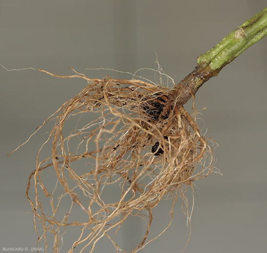 Independientemente de la gravedad del marchitamiento, los síntomas principales deben encontrarse en las raíces y las coronas de las plantas. En el primero, tanto la corteza como el cilindro, revelan numerosas lesiones color marrón rojizo que húmedas de rápidamente se pudren (figuras 1 a 3). Cuanto menor es el diámetro de las raíces, más rápido se pudren y se descomponen. Este es particularmente el caso de ciertos sustratos de cultivos sin suelo en los que son muy abundantes.