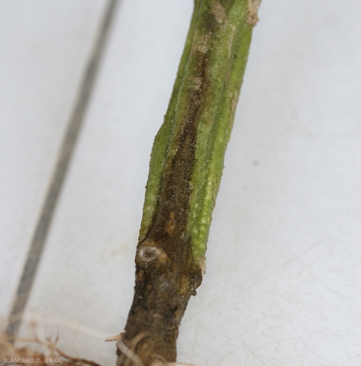 Con un chancro frecuencia se desarrolla en el cuello . Inicialmente se vuelve marrón oscuro y el tejido enfermo está más o menos deprimido (Figura 4). Este chancro suele evolucionar longitudinalmente, en un lado del tallo, tomando la forma de una llama que puede extenderse hasta más de 30 cm por encima del cuello (figuras 5 y 6). La parte central del chancro adquiere un tinte rosado salmón y un aspecto bastante mucoso, debido a la formación de la esporodoquia fúngica (figura 7).