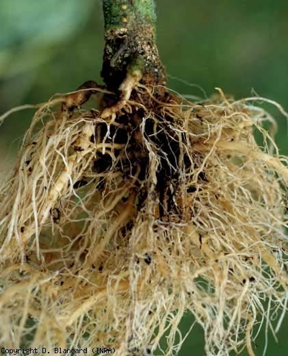 De Pythium spp. se aíslan con frecuencia raíces de de tomate aparentemente sanas o afectadas. Su presencia en un sistema de raíces no se asocia sistemáticamente con daños. De hecho, Pythium spp. revelan poderes patógenos muy diferentes en las raíces del tomate entre especies. Además, la expresión de su poder patógeno a menudo depende de interacciones complejas entre el desarrollo del hospedador (el tomate en este caso), el medio ambiente y Pythium spp. regalo. Es probable que varias especies provoquen un pardeamiento de las raíces ( pudrición de la raíz por Pythium, marchitez ) que a veces se encuentran al final de las raíces. Destacamos especialmente el pardeamiento, la descomposición y la desaparición de raicillas y raíces de pequeño diámetro. La corteza de las raíces principales y la raíz primaria también eventualmente se pudren más o menos localmente. Los tejidos vasculares opuestos a las áreas alteradas eventualmente se vuelven marrones. Estos síntomas a veces aparecen en el suelo (especialmente en los trópicos y subtrópicos húmedos), con mayor frecuencia en los sin suelo (en las zonas de producción templadas y septentrionales) (figura 6).
