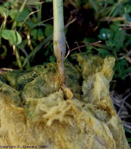 Nótese que en presencia de amortiguación, debemos tener en cuenta que un ataque de Thanatephorus cucumeris (Rhizoctonia solani ) provoca síntomas bastante similares.