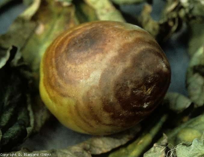 Los oomicetos también atacan a las frutas . La Phytophthora spp. son por tanto responsables de las lesiones irregulares, húmedas, de color verde grisáceo a pardo que aparecen en la porción de fruto en contacto con el suelo (figuras 8 y 9) a. Evolucionan con bastante rapidez y generan patrones en anillos concéntricos, completos o incompletos, de color marrón claro a marrón oscuro. Estas lesiones son bastante firmes, lisas en la superficie y no tienen un margen bien marcado. Un fieltro de micelio algodonoso puede cubrir las lesiones en condiciones de humedad ( P. nicotianae, P. capsici, P. drechsleri ??). Las lesiones causadas por P. mexicana aparecen de forma menos sistemática en anillos concéntricos.
