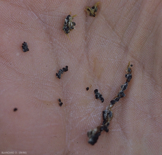 Los esclerocios aseguran en ocasiones la transmisión de estos hongos a otras parcelas, ya que son transportados a través del suelo en herramientas de arado o plantas. Como se informó anteriormente, a diferencia de Sclerotinia minor (especie heterotálica), Sclerotinia sclerotiorum (especie homotálica) genera más fácilmente apotecios (Figura 5), especialmente cuando las temperaturas son bajas entre 8 y 16 ° C. Las ascosporas producidas, varios miles por apotecios, son el origen de la propagación de la enfermedad por el viento, a veces a varios cientos de metros.