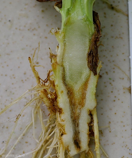 Una sección longitudinal de las raíces, la raíz principal y el tallo muestra que el sistema vascular está afectado. Revela un tinte verde pardusco que puede confundir con el daño por Fusarium .