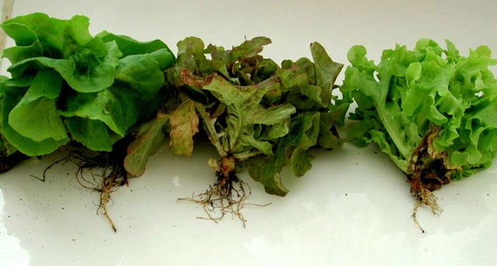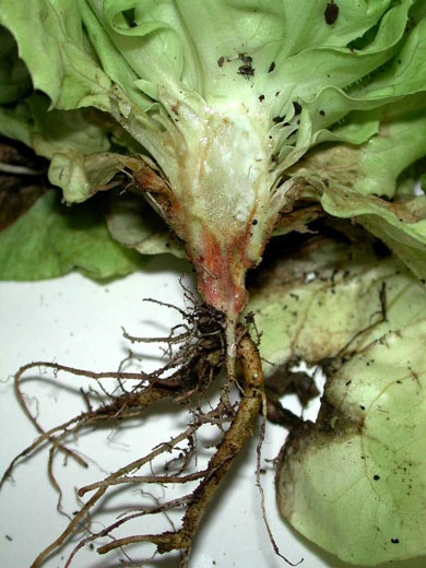 Las plantas adultas afectadas muestran síntomas radiculares y vasculares comparables a los observados en las plántulas. Una sección longitudinal revela vasos de color marrón (figura 2). Como resultado, las hojas de un lado de la lechuga se vuelven amarillas y se necrosan alrededor del borde del limbo.