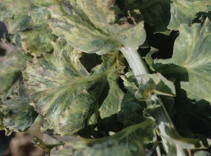 Les jeunes plantules infectées révèlent des feuilles déformées qui montrent par ailleurs des lésions chlorotiques, circulaires à allongées, localisées entre ou à proximité des nervures (figure 1). Si les attaques sont très précoces, la croissance des plantes est stoppée et elles finissent par mourir.