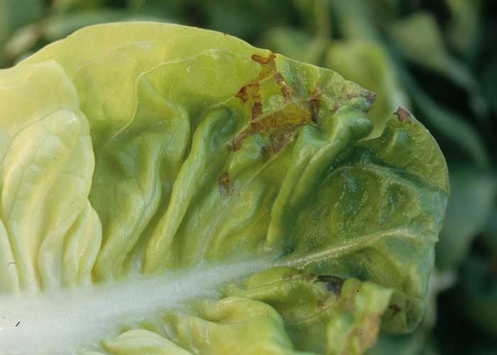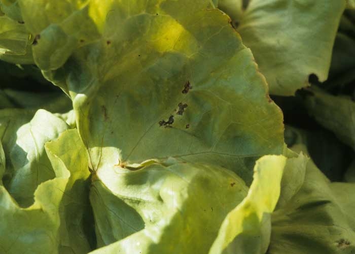 Toutes les feuilles ne sont pas forcément touchées. Dans un premier temps, les lésions sont plutôt réparties à la périphérie du limbe. Cette bactérie opportuniste s'installe aisément sur les tissus atteints de "Tip burn" (consulter le lien Nécroses marginales). Elle n'entraîne une pourriture de la moelle que durant des périodes de temps couvert et humide et sur certaines variétés de laitue.