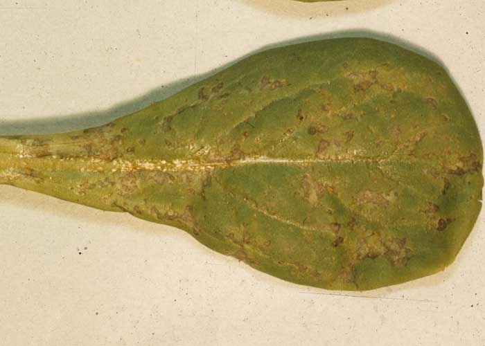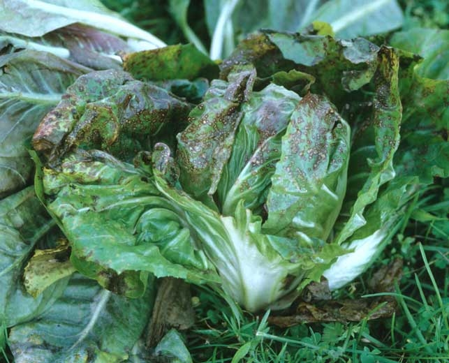 Ce champignon provoque des taches situées sur le limbe et à sa périphérie (figure 1). Ces taches sont brun foncé, rondes à ovales, parfois confluentes. Elles montrent des stries concentriques et se couvrent progressivement de conidiophores surmontés de conidies pluricellulaires très caractéristiques en forme de massue (figure 2). A terme, les tissus situés au centre des taches peuvent s'éclaircir (figure 3). Cet Alternaria semble capable d'attaquer l'endive, à un moindre degré la scarole et la laitue ; la frisée ne serait que faiblement sensible. Les jeunes feuilles de salade paraissent plus réceptives (figure 4).