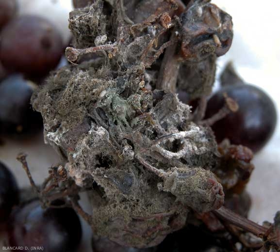 Nous insistons sur le fait que ces champignons sont fréquents dans certaines régions de production, mais qu'ils passent souvent inaperçus au coeur des grappes botrytisées. L'ouverture de plusieurs grappes permet plus facilement d'apprécier le phénomène. De plus, soulignons aussi l'association forte mise en évidence au vignoble entre la présence de géosmine au coeur des grappes, le développement plus ou moins important de B. cinerea sur celles-ci, et l'envahissement secondaire de ces dernières par des Penicillium spp., et notamment par P. expansum.