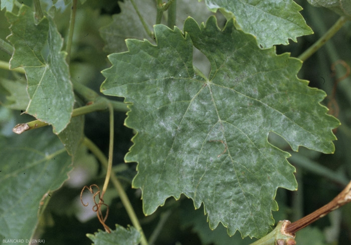 Erysiphe necator es un ectoparásito de la vid que crece en gran parte en la superficie de los órganos aéreos verdes. Su presencia en este último se materializa por un fieltro de conidios más o menos polvoriento en el origen del nombre anglosajón de la enfermedad del mildiú polvoroso y caracterizando estos síntomas.