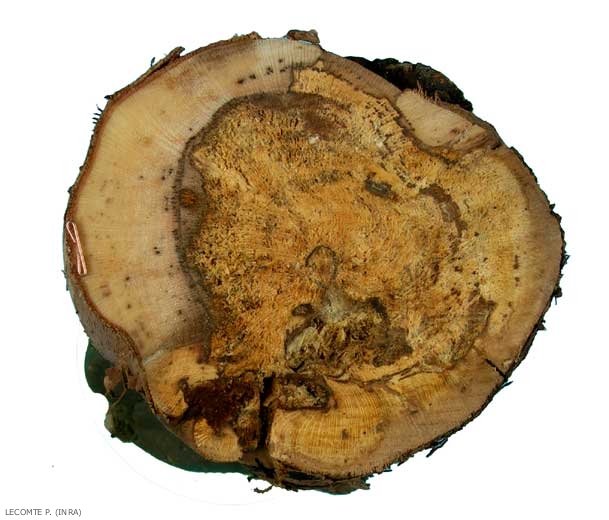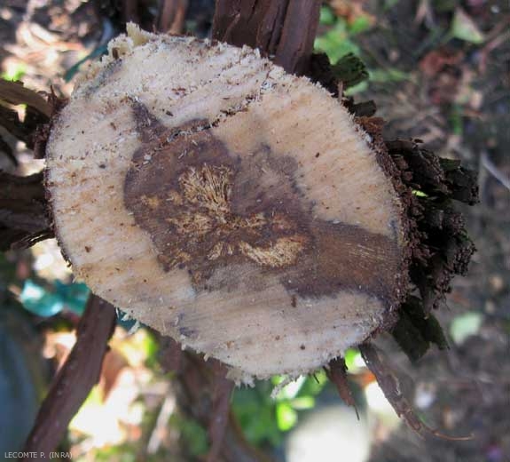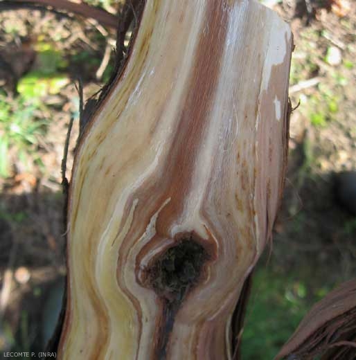 ** Los dos hongos pioneros, Phaeomoniella chlamydospora y y de Phaeoacremonium aleophilum las perforaciones negras , son responsables de la necrosis marrón central o sectorial visibles en las vides. menudo se aíslan otros hongos de la necrosis sectorial: varias especies de Botryosphaeria y, a veces, Agreguemos Eutypa lata, que a responsable de la eutipia.