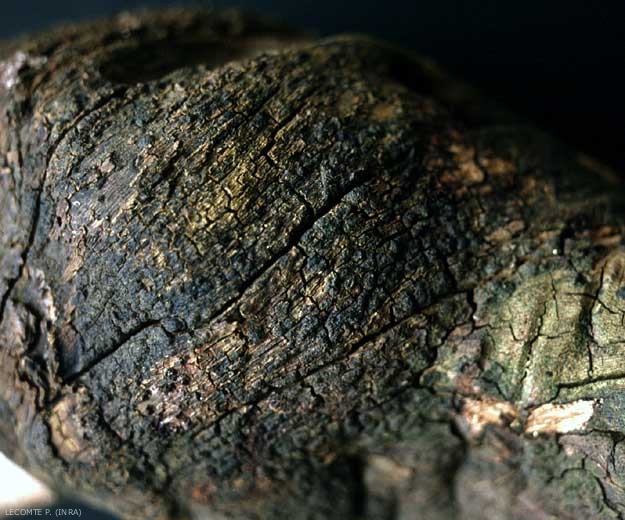 - La forma perfecta (teleomorfo), Eutypa lata , se caracteriza por una peritecia que se convierte en un estroma negruzco visible en la madera muerta en las áreas donde la corteza está exfoliada (Figuras 1 y 2). Estos peritecios globulares (300 a 500 µm) con un cuello bastante corto dan a la superficie de la madera colonizada un aspecto irregular. Contienen ascos (separados por paráfisis) cilíndro-claviformes, redondeados en la parte superior, provistos de un pedicelo largo (figura 3); su tamaño es de aproximadamente 30-60 x 4-7 µm. Cada ascus contiene típicamente 8 ascosporas que son de arqueadas (en forma de plátano) color amarillo pálido a marrón claro y miden 5-11 x 1,5-2 µm (Figura 4).