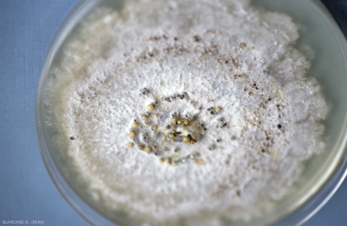 En medio de agar en placa de Petri , P. viticola con micelio hialino forma una colonia blanca con un contorno más o menos festoneado que se oscurece con la edad. Se pueden observar zonas concéntricas más oscuras en la colonia cuando está expuesta a alternancias día / noche, sobre las cuales se desarrollarán los picnidios (figura 11).