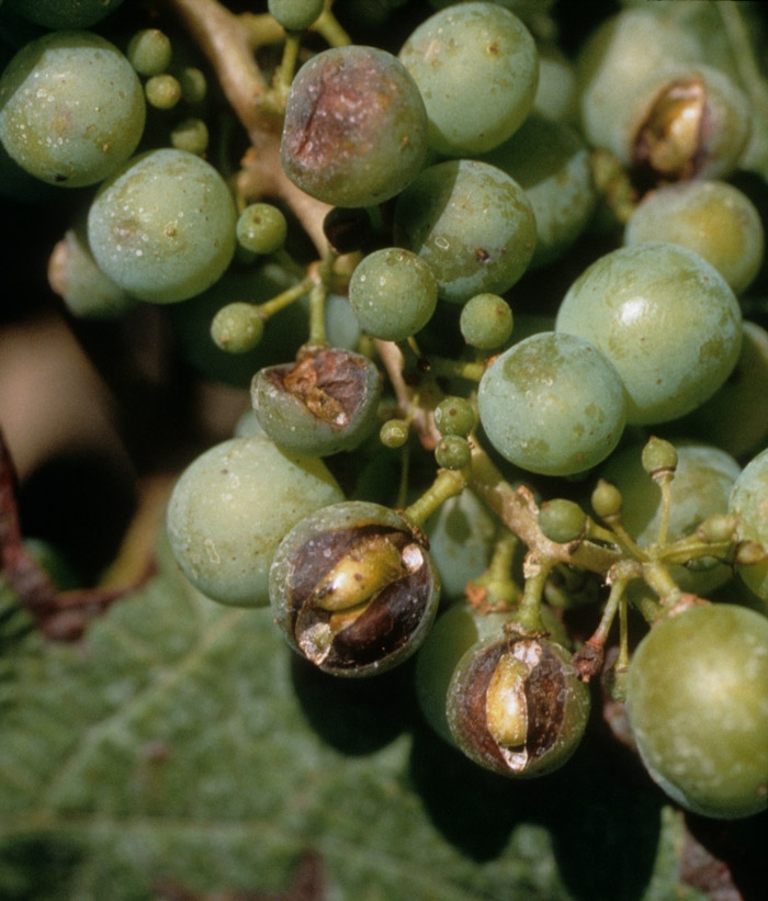 - Las bayas pueden volverse marrones y arrugarse o tener estallidos permitiendo que Botrytis cinerea u otros microorganismos responsables de la se desarrollen allí (ver la pudrición pudrición del racimo ). Si las condiciones climáticas son húmedas en los días posteriores al daño a las bayas, puede ser útil un tratamiento anti-Botrytis.