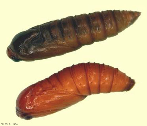 Les chenilles ont une tête et un thorax jaune brun (figure 2). Leur taille avant nymphose est inférieure à 2.5 cm.